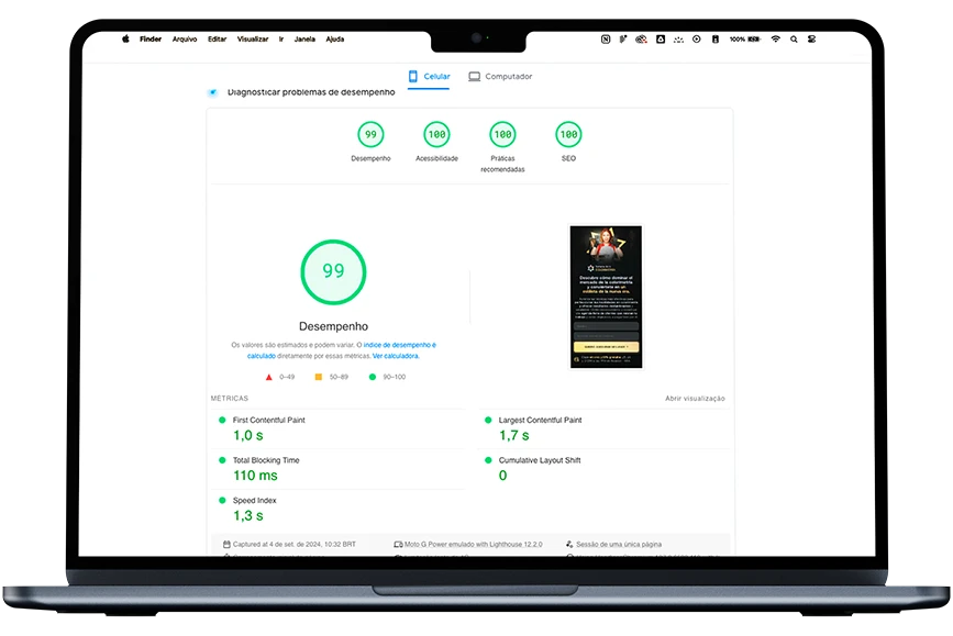 Desenvolvemos páginas rápidas e seguras, evitando a perda de visitantes no caminho do clique até o carregamento completo. Isso significa menor custo em tráfego pago e maior aproveitamento de cada clique.
